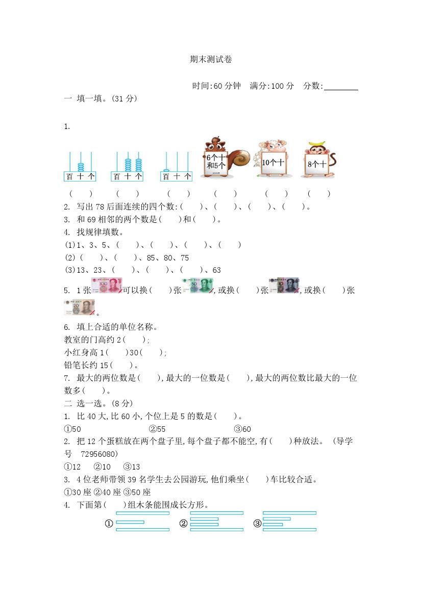 一(下)青岛版数学期末检测卷.2(54制)
